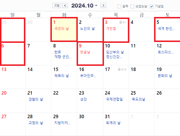 2024년 10월의 주요 공휴일